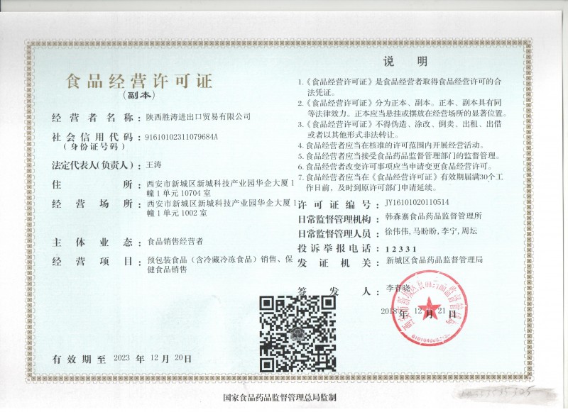 發(fā)證機(jī)構(gòu):   西安市新城區(qū)食品藥品監(jiān)督管理局 發(fā)證時間 :   2018-12-21